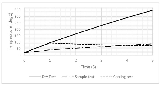 A 1D plot of the generated temperature versus time at the center point of the DFM in the dry test, the sample, and the cooling test.