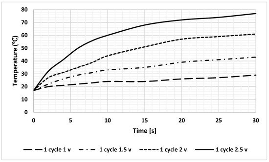 The simulation results revealed that heat calculations must consider sample-induced cooling, which was confirmed by a significant temperature drop during the analysis. To achieve sufficient practical heating rates to induce RNA aggregation without causing sample dehydration, the maximum feasible voltage was determined through extensive experimental trials that involved various voltage levels and heating durations. Based on these findings, the application of 2.5 V is recommended to reach a temperature of 75 °C within 30 s, as shown in Figure 10.