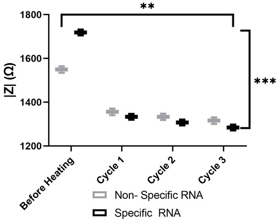 The impedance magnitude of the nonspecific probes and 100-specific HCV RNA probes. Two-way Anova p-value = 0.0013 between heating cycles. Where (**) represents a p-value of 0.01 or less and (***) represents a p-value of 0.001 or less.