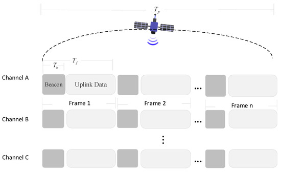 The LEO satellite’s dynamic movement across the area of IoT devices creates a highly variable channel, requiring the development of tailored media access schemes. Furthermore, network operations must minimize costly handshakes and conserve power when the satellite is not in view. These objectives can be achieved through a beaconing approach similar to that of LoRaWAN Class B [20]. Inspired by the work of [11], a data frame structure model activated by beacons has been proposed, which modified the calculation formulas for frame duration and skip probability. The data frame structure model is shown in Figure 2.