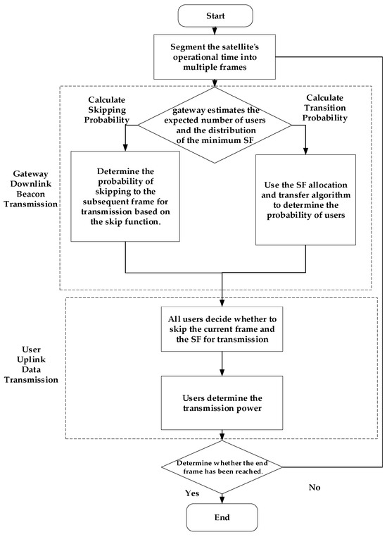 The algorithm operates as follows: The LEO satellite service time is divided into several frames based on the beacon-triggered data frame structure model. In each frame, downlink beacon transmission occurs first, followed by uplink data transmission. Before the downlink beacon transmission, the gateway assesses the expected number of service users within that frame and the distribution of minimum SF ratios based on historical data. The skip function in Equation (7) is then used to determine the probability of data packets skipping to subsequent frames for transmission. Simultaneously, a target SF ratio distribution is established using the SF allocation algorithm, and the probabilities of all SFs transitioning to others are determined via the SF transfer algorithm. This probability data and synchronization information are included in the beacon transmission.