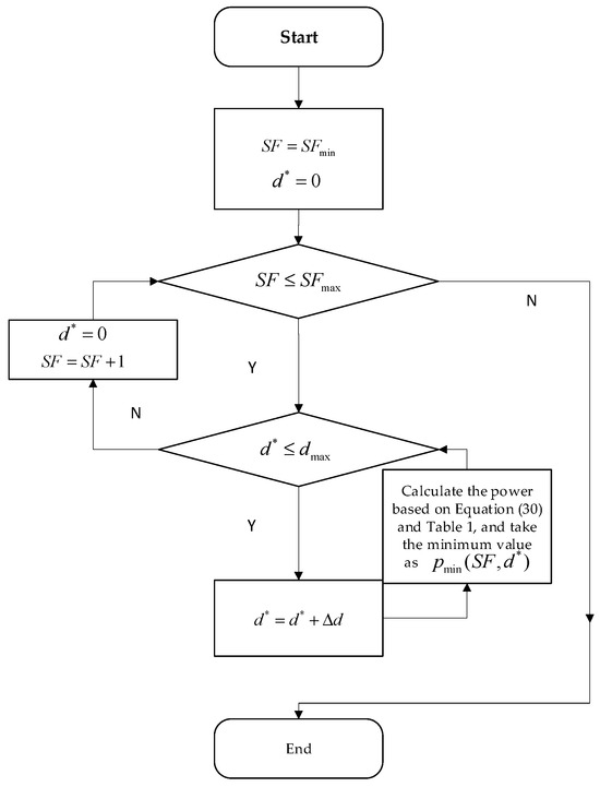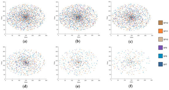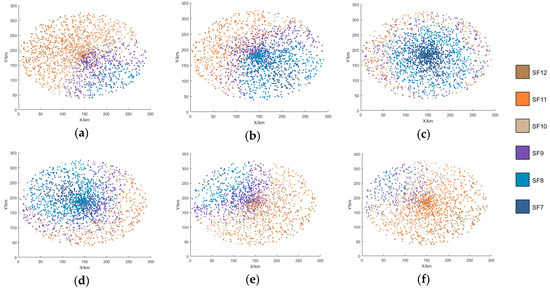 The optimal distribution of SFs can be obtained from Equation (19). For example, when the minimum SF for successful demodulation in the system is SF7, the optimal distribution is .