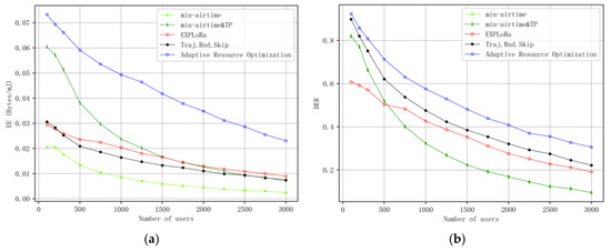 In terms of algorithm complexity, by analyzing the algorithm presented in this paper, the algorithm complexity can be further calculated and compared with other algorithms. The algorithm in this paper only performs iterations over the number of users and the six fixed types of SF. Since is much larger than SF, the complexity is . The other algorithms primarily iterate over the number of users as well, resulting in a complexity of . Thus, the complexity of the algorithm in this paper is comparable to that of other algorithms. However, the performance of the algorithm presented in this paper is superior to that of other algorithms.