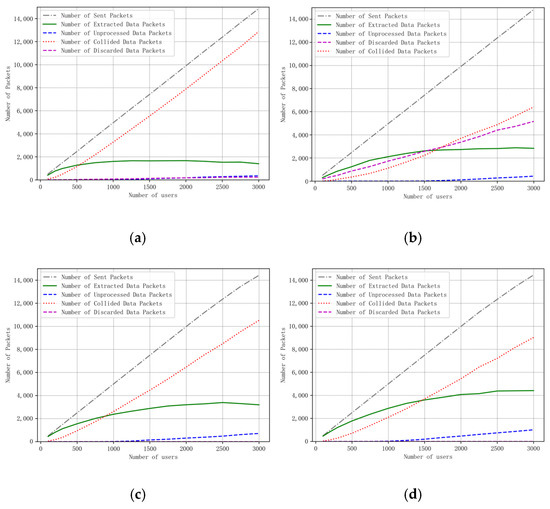 Curve of packet state in the network with the number of users. (a) min-airtime. (b) EXPLoRa. (c) Traj.Rnd.Skip. (d) Algorithm of this paper.