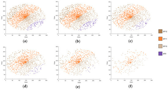 SF distribution of this paper’s algorithm. (a) 0–60 s SF distribution. (b) 60–120 s SF distribution. (c) 120–180 s SF distribution. (d) 180–240 s SF distribution. (e) 240–300 s SF distribution. (f) 300–360 s SF distribution.