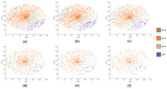 SF distribution of the min-AirTime algorithm. (a) 0–60 s SF distribution. (b) 60–120 s SF distribution. (c) 120–180 s SF distribution. (d) 180–240 s SF distribution. (e) 240–300 s SF distribution. (f) 300–360 s SF distribution.