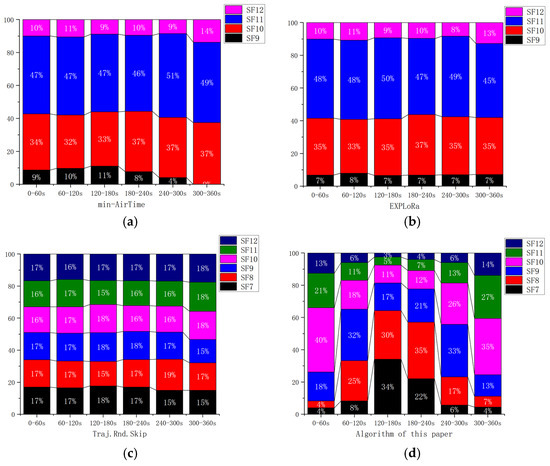 The Traj.Rnd.Skip algorithm employs a beacon-triggered data frame model that divides the satellite’s passage time into several frames. It also uses hopping parameters to spread data packets as evenly as possible throughout the satellite’s passage. However, the Traj.Rnd.Skip algorithm does not account for optimal ratio distribution, leading to sparse packet distribution in later time periods, as shown in Figure 9 and Figure 12c. Since the Traj.Rnd.Skip algorithm relies on trajectory information to randomly select an SF based on the minimum SF capable of demodulation, it results in a relatively uniform distribution in SF allocation.