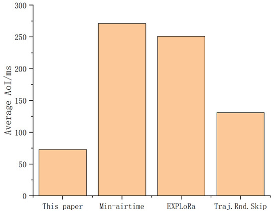 In scenarios with high real-time data requirements, high priority users are assigned SF7 and 8 in priority. Figure 12 shows the average AoI values of different algorithms, among which the algorithm proposed in this paper achieves the lowest AoI.