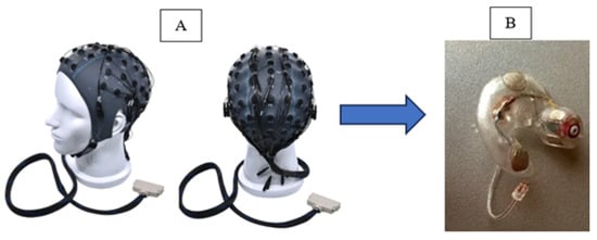 (A) Conventional EEG collection system and (B) wearable in-ear EEG device with embedded electrodes.