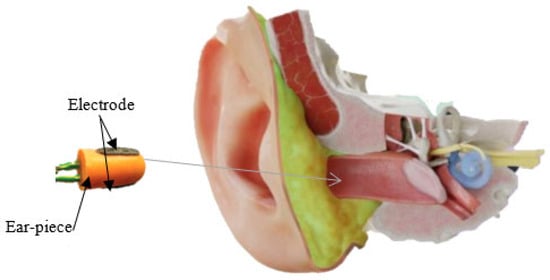 The external auditory canal from the pinna to the eardrum is generally 26 mm long and 7 mm in diameter. These dimensions have been considered in the design of ear-canal phones. In [], the designed device does not penetrate more than 10 mm into the ear, does not localize in the bone surrounding part of the ear canal, and does not affect the eardrum in any way. From an electrophysiologic perspective, the cortex exhibits bioelectrical signals that are attenuated by the cerebrospinal fluid, skull, and skin before these signals reach the ear canal. This attenuation of bioelectrical signals is similar to conventional scalp measurements using classical EEG [].