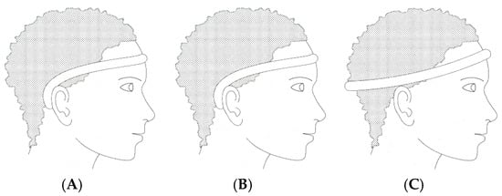 Different types of EEG recording headbands: (A) frontal, (B) near, and (C) full circle.