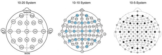 Beyond the traditional 10–20 system, higher resolution systems have been developed, such as the 10–10 and 10–5 systems. These systems introduce additional electrodes, providing a denser range of measurements, allowing more detailed mapping of brain activity. The 10–10 system places electrodes at 10% intervals, while the 10–5 system places them at 5% intervals, enhancing neurophysiology research capabilities and improving the granularity of EEG data collected during different studies (Figure 11).