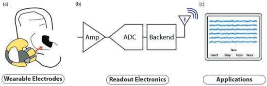 - Kaveh, R.; Doong, J.; Zhou, A.; Schwendeman, C.; Gopalan, K.; Burghardt, F.; Arias, A.C.; Maharbiz, M.; Muller, R. A Wireless, Multielectrode, User-generic Ear EEG Recording System. In Proceedings of the 2019 IEEE Biomedical Circuits and Systems Conference (BioCAS), Nara, Japan, 17–19 October 2019. [Google Scholar] [CrossRef]