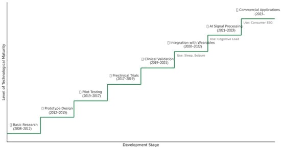 In recent years, various portable EEG modalities have been developed to improve comfort, mobility, and real-world usability compared to conventional scalp-based systems. These include wearable headbands with dry electrodes, periauricular devices positioned around the ear, tattoo-based flexible electrodes, and clip-on ear systems. Among these, in-ear EEG has emerged as a distinct and promising direction, offering a unique balance between signal fidelity and user comfort by integrating electrodes directly into the ear canal. While this review focuses primarily on in-ear EEG systems, it is important to consider them in the broader context of portable EEG technologies, where trade-offs exist between signal quality, ease of use, and degree of invasiveness. Further research directions have also focused on the use and integration of EEG in devices such as EEG headbands with dry electrodes (Figure 4), which eliminate the need for conductive gels while maintaining adequate signal fidelity.