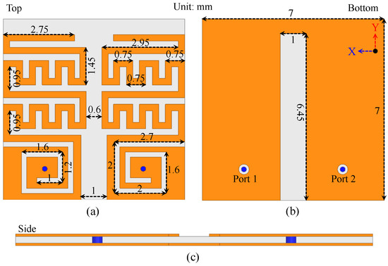 This multi-antenna system has a couple of embedded antenna units, each made of spiral and meandered resonators (Figure 1). The final optimized design and its complete dimensions are also given. The proposed design is simulated and fabricated on a high-permittivity Rogers 3010 substrate, known for its low tangent losses and high dielectric constant, which helps reduce the antenna volume. The spiral and meandered resonators are placed on top, and ground metal is positioned below the laminate. Two antenna units are placed face-to-face with a 0.6 mm edge-to-edge gap. The overall volume occupied by the antenna sensor is 7 × 7 × 0.25 = 12.25 mm3. This compact volume is achieved through miniaturization techniques using meandered resonating structures and a high-permittivity substrate. Both antenna units are excited using a coaxial probe, where miniaturization is further enhanced by the meandered and spiral geometry. Additionally, the high dielectric constant of the substrate contributes to miniaturization. Both antenna units operate at the same frequency band.