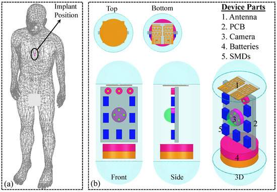 These implantable devices are equipped with an optical dome, camera, PCB, batteries, and various electronic and RF surface-mounted devices (SMDs). Thus, this system is also executed in the presence of these elements. Final design of the implantable device and its circuitry is shown in Figure 2b. The electronic and RF parts are located in a capsule made of polylactic acid (PLA) [dielectric constant = 2.8, loss tangent = 0.006]. This specific material is selected because it is biocompatible, a crucial attribute for biomedical implants. The suggested implant, which integrates the antenna, is 25 mm long and has a diameter of 12.8 mm. The capsule casing material has thickness of 0.25 mm. The PCB is 10 mm wide, 15 mm long and 1 mm thick. Each battery has a radius of 4.5 mm and height of 2 mm.