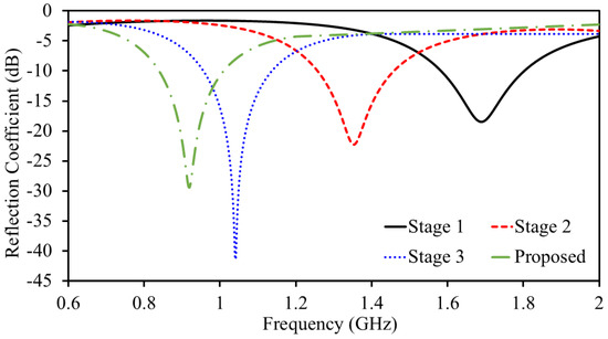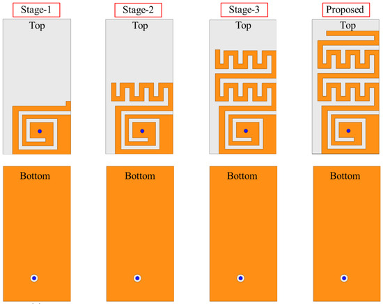 In Stage-I, the antenna resonance is noted to be at 1692 MHz. The reflection coefficient value at the resonance is found to be −18.39 dB. In Stage II, a meandered resonator is attached to the end of a spiral resonator, increasing the overall resonator length. As the length increases, the frequency shifts to a lower value, as verified by Equation (1). The adjacent arms of the meandered resonator introduce additional capacitance, which contributes to antenna miniaturization by lowering the resonant frequency. The role of this additional capacitance in altering the resonance can be verified with
