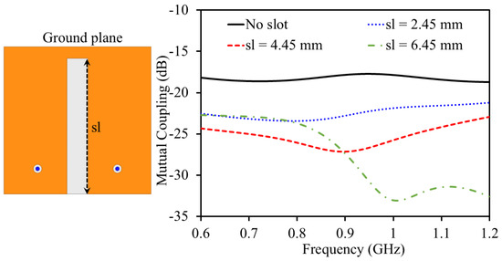 In Stage-II, the antenna resonance is noted to be at 1356 MHz. The reflection coefficient value at the resonance is found to be −22.23 dB. In Stage-III, a further meandered resonating structure is added to the previous one to extend the resonator length. This not only increases the resonator length but also adds additional capacitance. As mentioned earlier, the length of the resonator has an inverse relationship with frequency; therefore, the resonance shifts to lower frequencies. Moreover, the meandered geometry adds additional capacitance, which further lowers the frequencies according to the slow-wave equation. In Stage-III, the antenna resonance is noted to be at 1042 MHz. The reflection coefficient value at the resonance is found to be −41.34 dB. In Stage-IV (Proposed), the resonator size is further elongated to resonate at 915 MHz. In Stage-IV (Proposed), resonance is noted to be at 0.915 GHz and it has a bandwidth of 188 MHz (830–1018 MHz). The reflection coefficient value at the resonance is found to be −29.39 dB. Once one unit element of the MIMO system is finalized, a second one is placed at a distance of 0.6 mm (edge-to-edge) to construct a two-element implantable MIMO antenna sensor. Both unit elements share a same ground plane and a substrate which is desirable for a system level implementation. To improve the isolation between the two antenna elements, a small slot was introduced in the ground plane separating them. To evaluate the impact of the ground plane on mutual coupling, several simulations were conducted. Initially, a full ground plane (i.e., no slot) was considered, followed by a parametric analysis of the ground slot, as shown in Figure 5. Slot lengths of 2.45 mm, 4.45 mm, and 6.45 mm were investigated. When no slot was present (full ground plane), the antenna exhibited a mutual coupling value of dB at 915 MHz. Introducing a slot with a length of 2.45 mm reduced the mutual coupling to dB at 915 MHz. Increasing the slot length to 4.45 mm further improved isolation, yielding a mutual coupling of dB. Finally, with the proposed slot length of 6.45 mm, the mutual coupling was reduced to dB at 915 MHz. This design choice plays a key role, especially in compact implantable systems wherein space is limited and the antennas are positioned close together. Without any isolation technique, electrical currents flowing across the ground plane can easily pass from one antenna to the other. This interaction, known as mutual coupling, negatively affects performance by reducing isolation, increasing signal interference between the channels, and distorting the radiation patterns. The ground plane slot acts as a barrier that limits this current flow, essentially creating a high-resistance path between the antennas. By interrupting the surface current, the slot helps suppress unwanted interactions and significantly improves the isolation. Importantly, this approach does not depend on extra decoupling circuits or external components, making it especially suitable for miniaturized biomedical implants where simplicity, space, and compatibility with human tissue are all crucial.