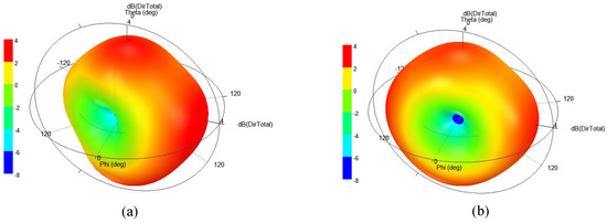 In the proposed MIMO antenna design, a PCB is placed vertically beneath the antenna structure. Extensive full-wave simulations were carried out to assess the impact of the PCB on the antenna’s performance metrics, including impedance matching, mutual coupling, gain, and radiation pattern. These simulations demonstrated that the presence of the PCB has a minimal to negligible effect on the antenna’s performance. The proposed antenna has a complete ground plane, which restricts coupling between the antenna and capsule components. Therefore, the antennas’ attributes were less impacted. The S-parameters of the antenna with and without the capsule device are shown in Figure 6. It can be observed that only a minimal impact has been observed from the capsule device. Moreover, 3D directivity pattern of the antenna (Antenna-II) with and without being integrated in the capsule device are shown in Figure 7.