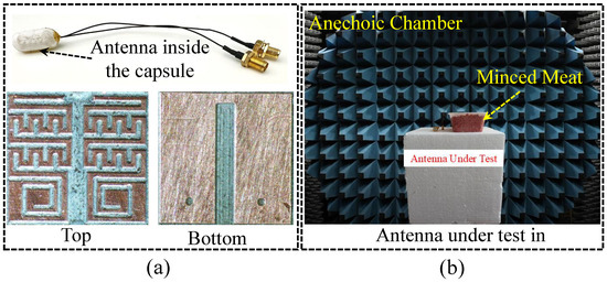 The effectiveness was investigated through simulations followed by the practical measurements. Therefore, the single-unit of the MIMO antenna sensor is designed at the beginning. Once the targeted goals are achieved for the design of one structure, the second unit is placed at a distance of 0.6 mm (edge-to-edge) to construct a two-element implantable MIMO antenna sensor. Then, a cut in the ground plane is added to block traveling of leaked current to the second one to enhance isolation level. After a fully workable implantable MIMO antenna sensor design is executed in phantom, a workable prototype of the same is constructed. For the prototype, initially a Gerber file for the top, bottom and board outline is prepared for the laser machine. First, copper layers are designed over Rogers 3010 substrate. Once the top and bottom layers are fabricated, a high laser beam is used to cut the boundaries of the prototype. The coaxial cables for antenna sensor testing are soldered in the ports region. The prototype is shown in Figure 8. The proposed antenna sensor is simulated inside a dummy capsule device. To obtain a more realistic performance comparison, the antenna sensor is tested inside the device as well. To achieve this, a 3D capsule device is made using a 3D printer. Then, a mini-PCB and batteries are placed alongside the fabricated antenna sensor. To measure the antenna sensor, it is embedded within the meat. The electrical properties of the meat are tested using a vector network analyzer to assess its resemblance to the simulation environment. Once confirmed, measurements are performed. Before measuring the antenna sensor, all equipment is calibrated for best results.