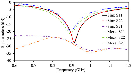 The S-parameters are measured through the well-calibrated vector network analyzer, where both reflection coefficients (S11 and S22) and isolation level (S21) are measured, as presented in Figure 9. The simulated antenna resonance (S11 and S22) is noted to be at 0.915 GHz and it has a bandwidth of 188 MHz (830–1018 MHz), as presented in Figure 9. The simulated value for both S11 and S22 at the resonance is found to be −29.39 dB. A simulated isolation level greater than 28.7 dB is found within the resonance. The resonance of the measured S11 and S22 is found to be at 904 MHz. The measured bandwidth is found to be 134 MHz (S11) and 165 MHz (S22). The measured reflection coefficient value for S11 and S22 at the resonance is found to be −19.95 dB and −21.52, respectively. A measured isolation of 27.8 dB is found on the resonance frequency.