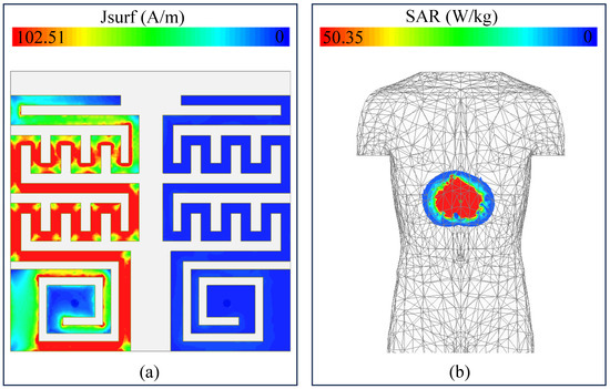 Simulated (a) surface current density at 915 MHz and (b) SAR at 915 MHz.