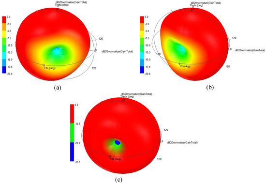 The 3D far-patterns of the antenna (Antenna-I, Antenna-II, and combined pattern of both antennas) are evaluated, as shown in Figure 11. The radiation patterns are almost omni-directional, which are very useful for wireless capsule implant devices. Devices having such beams are useful as they travel along the GI tract and randomly change their directions. In case of such patterns, the data can be delivered at any direction without any disruption. The simulated gain at 915 MHz is found to be −26.2 dBi. For the same frequency, the measured gain is noted as −27.7 dBi.
