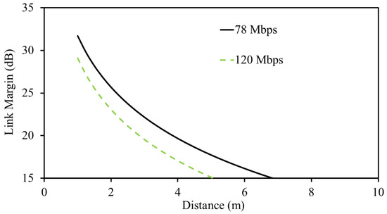 In the above equations, LM is the link margin, is the available power to extract data from, is the actual received power by the dipole antenna placed in external node, is the transmitted power from the capsule implant which is selected based on the IEEE standard, is th gain of the transmitter antenna (in our case, the transmitter antenna is the MIMO antenna sensor), is the phase-shift-keying whose value is set to be 9.6 dB, is fixing deterioration whose value is set to be 2.5 dB, and is the bit-rate. In this study, we fixed the bit-rate at 78 Mbps and 120 Mbps. These values are specifically selected to satisfy the requirement of next-generation capsule implants, where high-resolution cameras are installed [28]. For the link margin, the distance from the antenna sensor to the dipole antenna (installed in an external node) is varied and the value is recorded, as shown in Figure 12. Normally, a 0 dB link margin is enough for wireless communication. However, considering practical constraints and unexpected losses, we considered a link margin of 15 dB for seamless communication. With this specific value, the MIMO implantable antenna sensor can effectively communicate up to 6.77 m and 4.81 m at 78 Mbps and 120 Mbps, respectively.