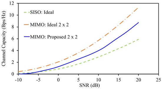 where each channel coefficient contains both gain (magnitude) and phase information. In this work, the channel capacities for the ideal single-port antenna, ideal dual-element MIMO antenna system, and proposed dual-element MIMO antenna system is calculated using (6), as shown in Figure 13. In an ideal dual-element MIMO antenna system, the channel capacity is based on the uncorrelated elements. However, in the proposed one, the correlation between the elements is taken into consideration. Based on (6), the ideal dual-element MIMO antenna system has better channel capacity than the other two. In addition, the proposed system has better channel capacity than the single-port antenna but lower than the ideal one. This is due to the fact that zero correlation between the elements is considered in ideal scenarios. At a signal-to-noise ratio of 20 dB, the channel capacity of the proposed system reaches 8.75 bps/Hz.