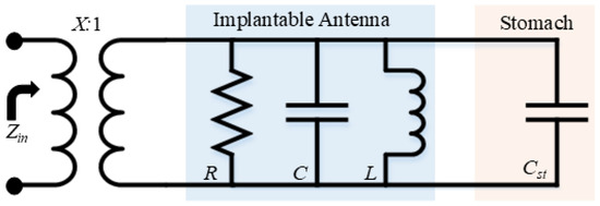 When an implantable antenna is placed in the vicinity of tissue, the surrounding tissue behaves like a dielectric layer. This interaction creates a capacitance with the antenna. For ease of understanding, the overall antenna structure and surrounding tissues are modeled using lumped circuits. The equivalent circuit is shown in Figure 14, where RLC section shows the antenna behavior while the stomach tissue is represented with a capacitor (). The factor X shows the impedance matching between the source and antenna. In this case, the source is a coaxial cable which has a 50 impedance.