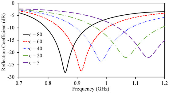 Figure 15 shows the antenna’s reflection coefficient (S11) as the stomach tissue’s permittivity changes. A decrease in permittivity causes the resonant frequency to shift toward higher values. For instance, the antenna resonates at 1.146 GHz (permittivity = 5). However, as the permittivity increases to 80, the resonant frequency drops to 0.86 GHz.