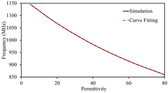 The antenna demonstrates excellent matching across all conditions, with S11 consistently remaining matched. Figure 16 presents the obtained with simulations and curve fitting. The curve fitting is obtained by considering the S11. It is worth mentioning that both S11 and S22 are the same because both are similar in shape and size. The following polynomial regression equation shows the relationship of resonance with permittivity: , achieving a high statistical accuracy with an value of 0.999. In this equation, f represents the antenna’s resonant frequency, while corresponds to the permittivity.