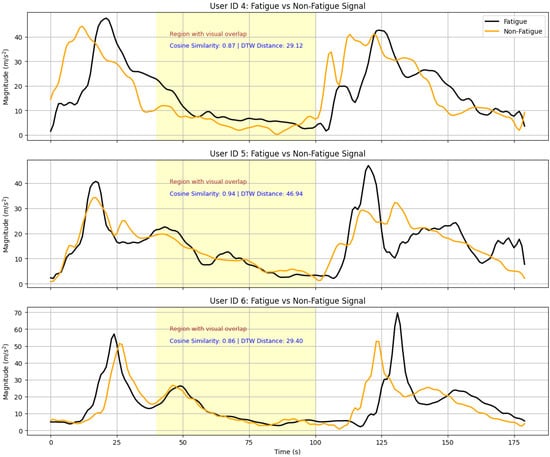 Comparison of fatigue and non-fatigue accelerometer signals from three different users. Each subplot shows one representative sample per class, extracted from running sessions. The yellow-highlighted region (time index 40–100) indicates a temporal window where the waveform patterns between fatigue and non-fatigue signals exhibit visual similarity. To quantitatively support this observation, we report Cosine Similarity and Dynamic Time Warping (DTW) distance between the two signals. Cosine Similarity captures directional similarity (1.0 = identical), while DTW accounts for temporal misalignment (lower values = more similar). These metrics further emphasize the challenge of signal overlap, motivating the need for context-aware example selection in few-shot prompting.