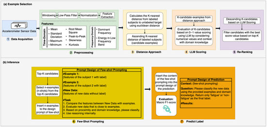 In this section, we outline the design of a few-shot prompting strategy for fatigue prediction, leveraging the GPT-4o-mini model (OpenAI, San Francisco, CA, USA; accessed in March 2025) with a temperature setting of 0.3. Our approach integrates several key components: domain knowledge, instructions, context, and questions. Each element is critical in crafting effective prompts tailored to the task. For the context component, we employ a selection process to identify the most relevant examples based on evaluation results from LLM scoring. These examples are then filtered down to two, forming a 2-shot prompting setup. To ensure balance and enhance the model’s interpretability, we carefully select one example labeled as “fatigue” and another labeled as “non-fatigue”. This approach provides a clear distinction between the two states, aiding the model in better understanding the task.