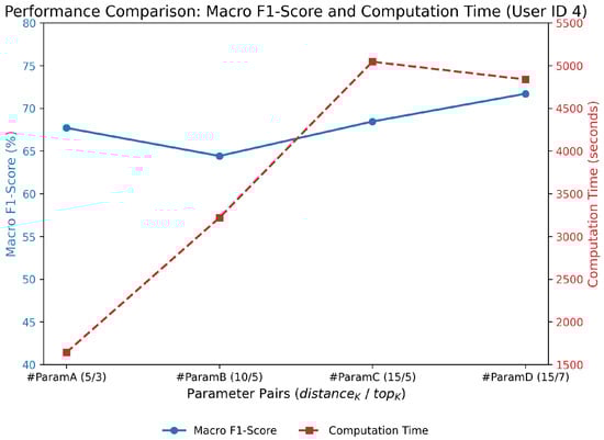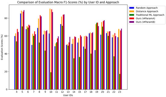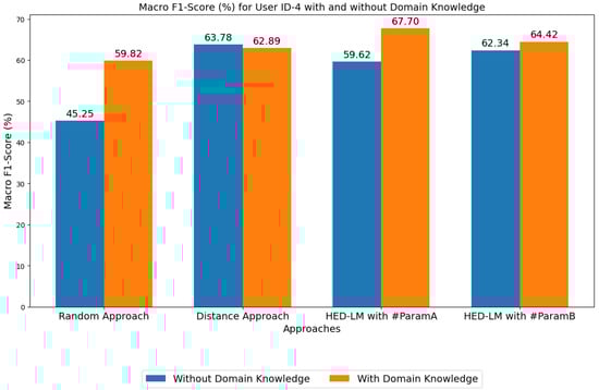 By comparing the confusion matrices, we aim to identify whether our proposed approach effectively addresses the limitations of the baselines. Precisely, we assess improvements in handling minority classes, reducing misclassification errors, and achieving a more balanced distribution of predictions across different classes. Figure A5, Figure A6 and Figure A7 illustrate the confusion matrices for the random, distance-based, and traditional machine learning approaches for individual participants. In contrast, Figure A8 and Figure A9 highlight the confusion matrices for our two parameterized approaches, evaluated under the same conditions. These comparisons demonstrate the effectiveness of our method in overcoming baseline weaknesses and achieving a more robust and balanced predictive performance. Meanwhile, Figure A10 shows the confusion matrix of User ID 4 performance without domain knowledge.