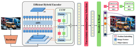 As a next-generation object detection model based on the Transformer architecture, RT-DETR achieves an outstanding balance between real-time performance and detection accuracy. The detailed network structure of RT-DETR is illustrated in Figure 2. By introducing an innovative feature processing mechanism, RT-DETR adopts a hierarchical strategy for multi-scale feature handling: it first enhances features within each scale and then performs cross-scale feature integration. This approach not only significantly reduces computational overhead but also completely eliminates the post-processing steps found in traditional detectors, resulting in a smoother and more efficient inference process. From an architectural perspective, RT-DETR consists of three key modules: a feature extraction backbone, a hybrid feature enhancement encoder, and a Transformer decoder with an auxiliary prediction mechanism. For the backbone network, the model employs an efficient CNN architecture, which can be either the widely used ResNet [] series or the specially optimized HGNet []. This choice is driven by the need for real-time performance, as CNNs demonstrate superior efficiency and practicality in the feature extraction stage compared to other architectures. In the feature processing stage, RT-DETR incorporates two innovative modules: the Attention-Enhanced Intra-Scale Feature Interaction (AIFI) Module and the Convolution-Driven Cross-Scale Feature Fusion (CCFM) Module. The AIFI module vectorizes deep features using a lightweight Transformer encoder, followed by feature reconstruction through a feedforward network. Finally, the CCFM module intelligently fuses multi-level features to generate a rich feature representation. For the detection head, RT-DETR adopts the denoising strategy inspired by DINO [], which significantly improves sample matching quality and accelerates the model’s convergence.