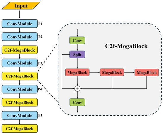 A CSPDarknet-based Backbone with an Innovative CSP-MogaBlock Hybrid Architecture: This study introduces CSPDarknet [] as the new backbone network and proposes an innovative CSP-MogaBlock hybrid architecture. This design enhances the model’s ability to capture spatial and channel-wise feature interactions while simultaneously reducing overall model complexity.
