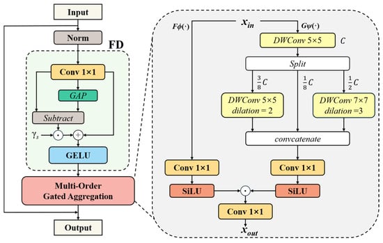 where X is the input feature map and Norm(X) denotes the normalization of the input X. FD represents the feature decomposition module, while Moga denotes a multi-order gated aggregation module comprising the gating Fϕ(·) and context branch Gψ(·).