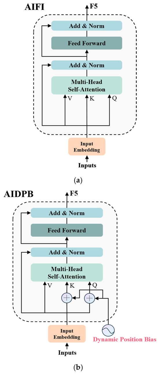 AIFI network architecture and AIDPB network architecture diagram. (a) Schematic diagram of the AIFI structure. (b) Schematic diagram of the AIDPB structure.