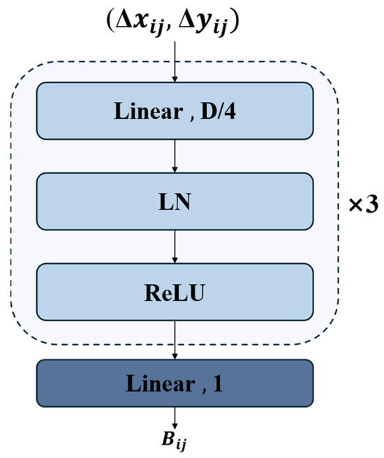 As shown in Figure 8, the DPB structure takes the relative position offsets (Δxij, Δyij) as inputs and processes them through a carefully designed network architecture. Specifically, the inputs first pass through a linear layer with a dimension of D/4, followed by three repeated modules, each consisting of Layer Normalization (LN) and ReLU activation. Finally, a linear layer with an output dimension of 1 generates the position bias value Bij. This architecture, with its compact design, dimensionality reduction (D/4), and simple network structure, effectively learns spatial relationships embedded in positional offsets while maintaining computational efficiency.