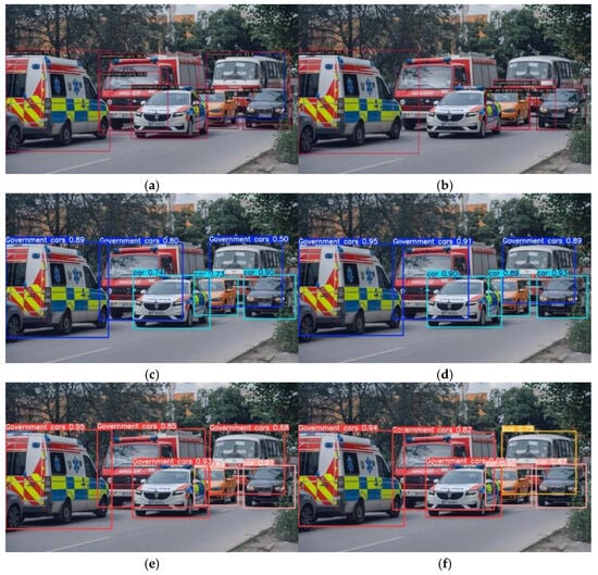 To comprehensively assess the performance of RT-DETR-EVD in emergency vehicle detection, we compare it against six widely used detection models: Faster-RCNN, SSD, YOLOv8m, YOLOv11m, RT-DETR-r18, and RT-DETR-EVD. All models are trained from scratch and evaluated under identical datasets and experimental conditions to ensure a fair and consistent comparison. The comparative results are presented in Table 7. It is worth noting that, without pretrained weights and given the limited diversity of government vehicle samples in the dataset, some YOLO series models failed to correctly distinguish government vehicles from ordinary cars, as shown in Figure 11. This highlights the challenge of learning fine-grained category distinctions from limited data and suggests potential future improvements through the use of pretrained features or enhanced data augmentation strategies.