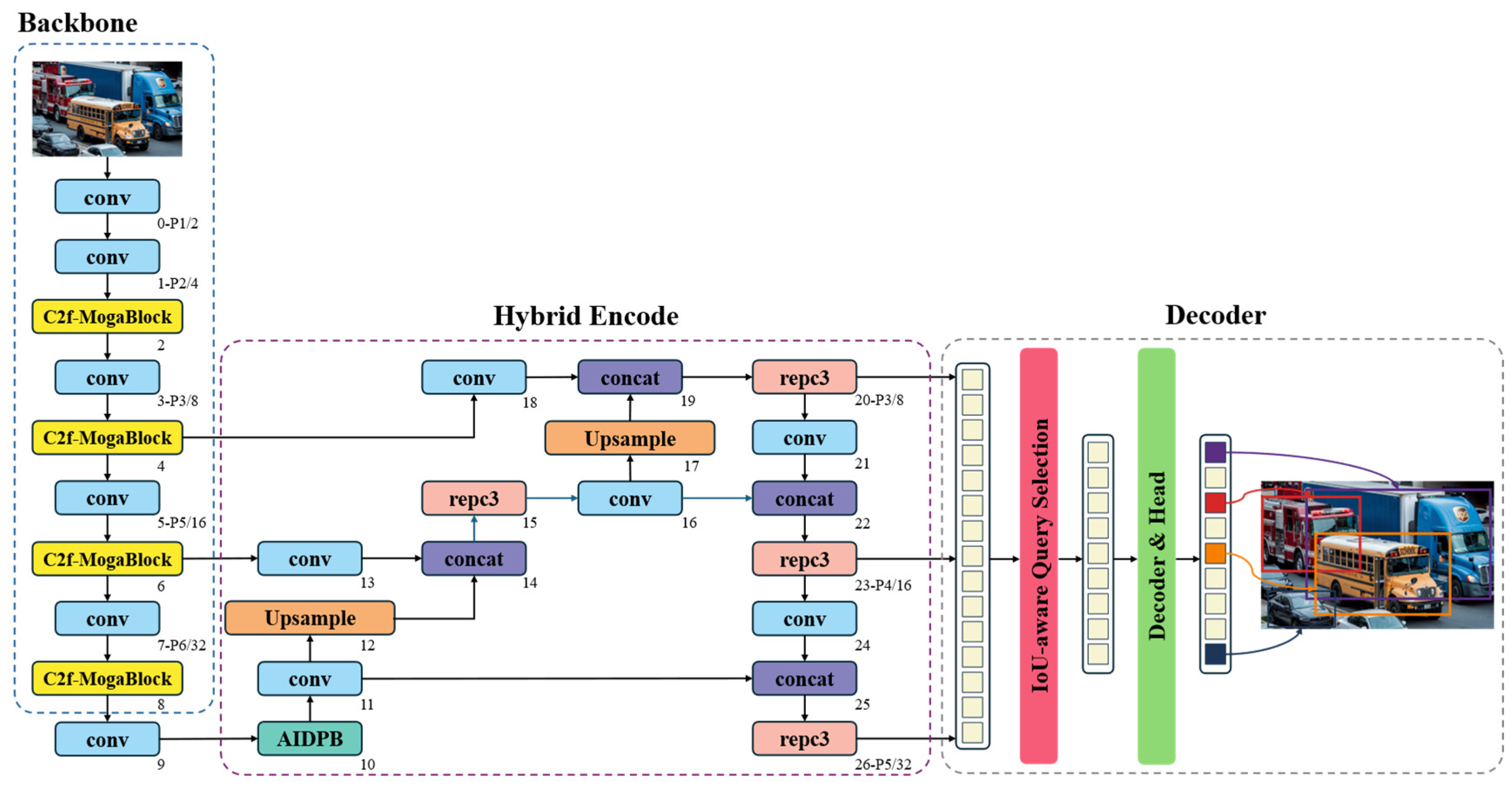 As a next-generation object detection model based on the Transformer architecture, RT-DETR achieves an outstanding balance between real-time performance and detection accuracy. The detailed network structure of RT-DETR is illustrated in Figure 2. By introducing an innovative feature processing mechanism, RT-DETR adopts a hierarchical strategy for multi-scale feature handling: it first enhances features within each scale and then performs cross-scale feature integration. This approach not only significantly reduces computational overhead but also completely eliminates the post-processing steps found in traditional detectors, resulting in a smoother and more efficient inference process. From an architectural perspective, RT-DETR consists of three key modules: a feature extraction backbone, a hybrid feature enhancement encoder, and a Transformer decoder with an auxiliary prediction mechanism. For the backbone network, the model employs an efficient CNN architecture, which can be either the widely used ResNet [28] series or the specially optimized HGNet [29]. This choice is driven by the need for real-time performance, as CNNs demonstrate superior efficiency and practicality in the feature extraction stage compared to other architectures. In the feature processing stage, RT-DETR incorporates two innovative modules: the Attention-Enhanced Intra-Scale Feature Interaction (AIFI) Module and the Convolution-Driven Cross-Scale Feature Fusion (CCFM) Module. The AIFI module vectorizes deep features using a lightweight Transformer encoder, followed by feature reconstruction through a feedforward network. Finally, the CCFM module intelligently fuses multi-level features to generate a rich feature representation. For the detection head, RT-DETR adopts the denoising strategy inspired by DINO [30], which significantly improves sample matching quality and accelerates the model’s convergence.