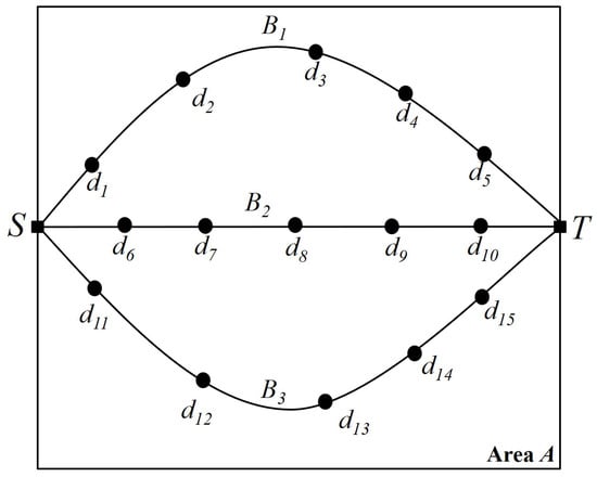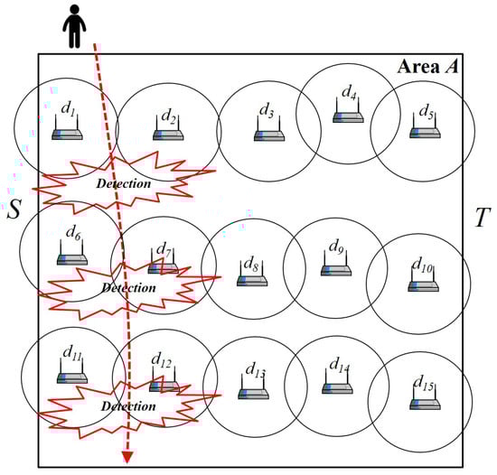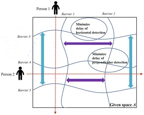 Figure 1 shows the barrier concept and penetration detection in the given square-shaped area A, called the K-barrier, where K is the required number of barriers to be formed in the area. As seen in Figure 1, there are three independent barriers, each composed of heterogeneous devices with wireless sensing ranges. With these barriers, it is guaranteed that any penetration from top to bottom or from bottom to top is detected by at least one sensor in the barrier. Figure 2 depicts the graph representation of a barrier and its transition from a device. Given area A, there is a set of devices . From source S to destination T, we can search for the possible maximum number of independent paths or node-disjoint paths between S and T. Each independent path can be considered one barrier, so we have three different barriers and . Also, Figure 3 depicts the two-way detection-enabled barrier example of minimizing the maximum delay of horizontal and perpendicular detection when mobile objects go into the given space. As can be seen, the maximum delay for mobile objects can vary according to the positions of the multiple barriers created.