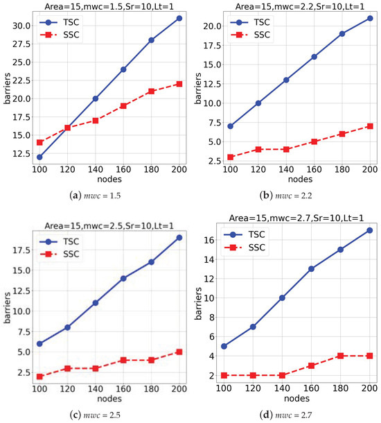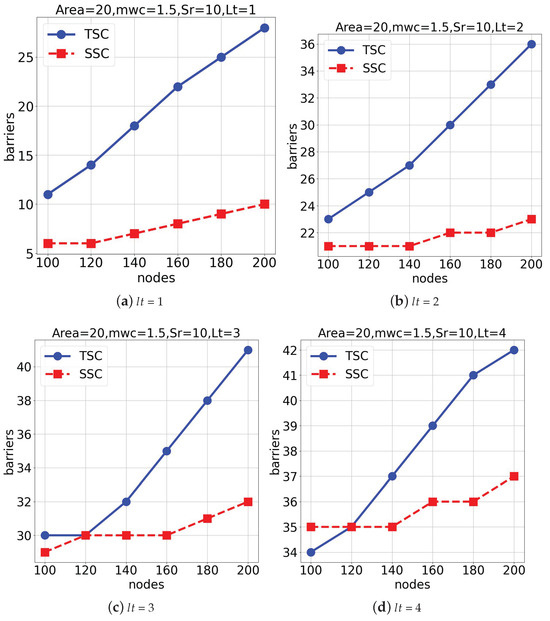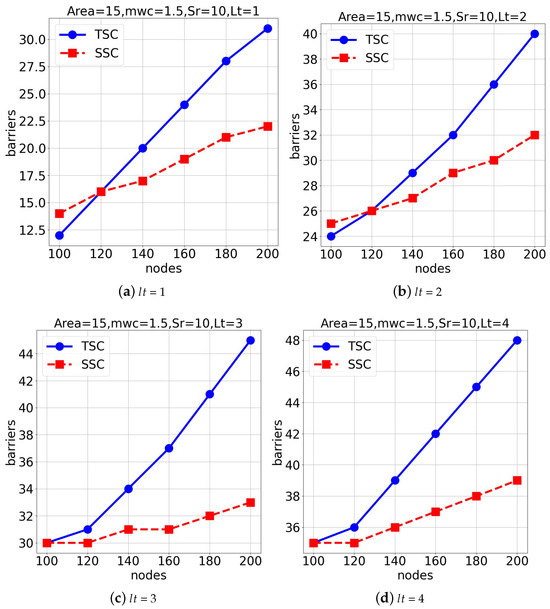 In the first experimental group, we evaluated both algorithms in a space of under average weather conditions ( = 1.5), as seen in Figure 7. The aim of this experiment was to observe the number of deep learning-assisted surveillance barriers generated as the node or sensor count increased. Figure 7a,b show the results for lifetimes () of 1 and 2. Also, Figure 7c,d present the outcomes for lifetimes () of 3 and 4, respectively. The TSC algorithm generally outperformed the SSC algorithm under these settings.
