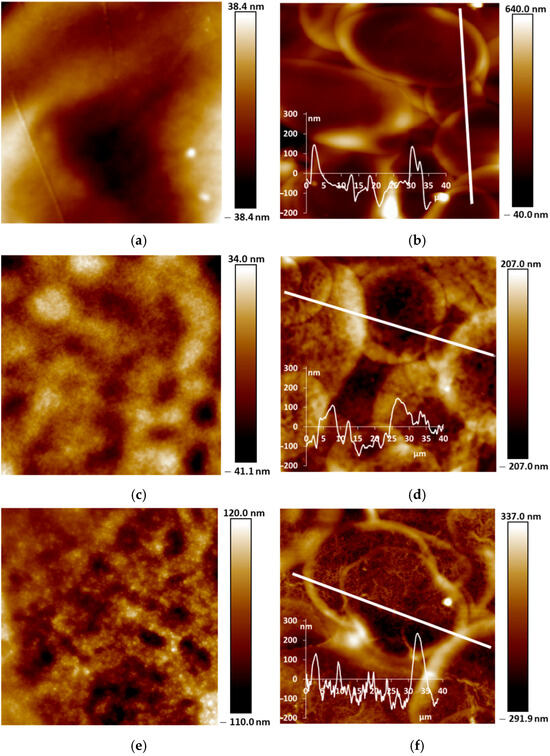 For PANI-i-PASA, particles with a diameter of 50–60 nm are clearly visible (Figure 5e and Figure 6e), dried-up droplets, with a diameter from of 20 to 30 µm; the edges of the drops are thin—4 µm; the height of the edges is up to 200 nm (Figure 5f). One can observe an even finer internal morphology of the films with barely noticeable layers along the substrate (Figure 6f).