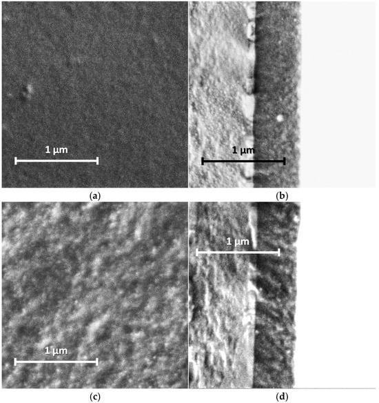 Our studies of the morphology of spray-coated films revealed that they are more dense and uniform and have roughness lower in small scale (5 µm × 5 µm) than the electrochemically synthesized films [12]. This is due to the coating procedure, which includes drying at each step of spraying of nano-sized aqueous dispersions. AFM and SEM images of the PANI films are shown in Figure 5 and Figure 6. One can see the presence of macro-roughness with abrupt height peculiarities on the scale of 40 µm × 40 µm and the intrinsic roughness on the scale of 5 µm × 5 µm. PANI−PSSA film has a very uniform and smooth morphology on the small scale (Figure 5a and Figure 6a). At the same time, the macro-roughness of PANI-PSSA is the highest—150 nm, and oval droplets from 14 to 25 µm are clearly visible, with a height difference of up to 400 nm on the 40 µm × 40 µm scale (Figure 5b). PANI-PAMPSA film has fibrous morphology (Figure 5c and Figure 6c) and consists of round, dried-up droplets, with the diameter from 15 to 20 µm; the height of the edges of droplets is 100 nm (Figure 5d). The cross-section of PANI-PAMPSA and PANI-PSSA revealed a very dense and homogeneous structure, with lower nanorelief in the case of PANI-PSSA (Figure 6d,b).