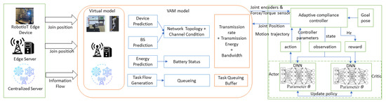 Figure 2 illustrates the Virtual, Augmented, and Mixed-Reality (VAM) network architecture and AI-driven IoT systems. The robotics edge network is modeled as a time-slotted system and is represented as a directed graph , where is the set of robotic devices, represents the frame stations, and defines the connectivity between devices and base stations. Each robotic unit is characterized using the parameter set , which is defined as the robot’s power, location, and server capacity, determining how much data it can process or transmit. This ensures efficient resource allocation for welding tasks: