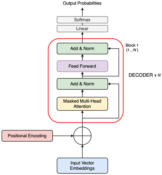 Transformers have demonstrated exceptional scalability and generalization, which is why they are the architecture of choice for models such as LLaMA [31]. The LLaMA architecture can be defined as a decoder-only technology; unlike encoder–decoder models, which separately encode input sequences and decode outputs, decoder-only models process inputs and generate outputs using a single transformer stack. This design is optimized for autoregressive language modeling, where the model learns to predict the next token in a sequence conditioned on previous tokens. The autoregressive language modeling objective is defined as follows: