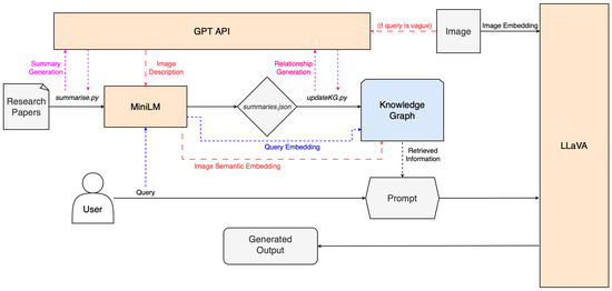 The proposed system is designed to enable multimodal LLM inference over a domain-specific knowledge graph, grounded in both image and text inputs. The core idea is to enhance a vision–language model (LLaVA 1.5) with external academic knowledge through the use of a graph-based retrieval-augmented generation (GraphRAG) pipeline. The architecture is constructed in modular stages: it begins by processing a corpus of academic research papers in PDF format, which are automatically parsed using PyPDF2. Each paper is summarized using GPT-4 to ensure coherent and contextually relevant abstracts. Titles are extracted using an additional GPT prompt, and keywords are automatically generated via KeyBERT. These metadata fields (title, summary, and keywords) are then stored in a JSON file, which is used to populate a Neo4j knowledge graph. To enhance the graph’s semantic utility, relationships between papers are also automatically generated using GPT-4, based on comparative reasoning over summaries and keywords. These relationships are stored as directed edges in the graph with type and explanation attributes, forming a rich interconnected corpus of research knowledge.