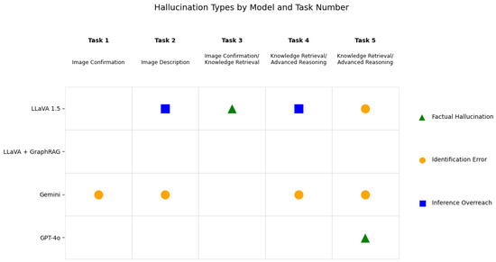 A total of nine hallucinations were observed across the five evaluation tasks. Notably, the GraphRAG-augmented LLaVA was the only model that exhibited zero hallucinations, suggesting that the addition of the retrieved information significantly improved factual stability and contextual alignment. In contrast, LLaVA 1.5 demonstrated the highest number and diversity of hallucinations, including one factual (Task 3), two inferential (Tasks 2 and 4), and one identification error (Task 5), suggesting a tendency to overgeneralize or speculate. Gemini consistently produced identification errors across four tasks (Tasks 1, 2, 4, and 5), typically mislabeling image content or confusing object descriptions. Finally, GPT-4o exhibited a single factual hallucination in Task 5, indicating a generally strong performance, though not immune to inaccuracies. Overall, these findings highlight the importance of structured retrieval mechanisms like GraphRAG for reducing hallucinations in domain-specific, image-grounded tasks. These results are shown in Figure 10.
